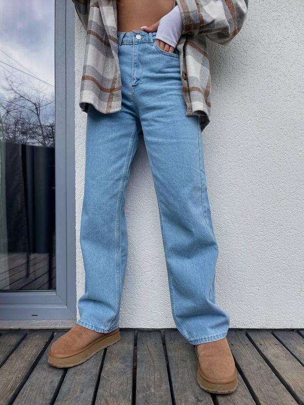 Джинси ▪️Производитель Турция ▪️Цвет: голубой ▪️Тканина: джинс ▪️Состав: коттон 100% ▪Размеры: 34-XS,36-S,38-M Незаменимые джинсы трубы-палаццо Именно то что нужно для каждой красавицы Высокая посадка прямой крой Джинсы которые не выходят из моды