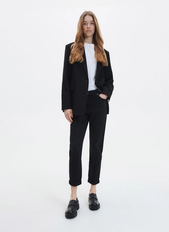 Джинсы черные. Можно носить в длинном распрямленном варианте, а можно "подготовить" (как на фото)