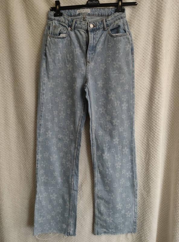 Джинсы с необработанным краем снизу размер М, пот 35см, длина 110см, длина внутреннего шва 78 см, поб 51см, посадка спереду 32см.