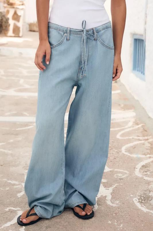 Струмуючі джинсові штани зі шнурками для регулювання на поясі, кишенями по боках, накладними кишенями ззаду та середньою посадкою. Застібка на блискавку та металевий ґудзик спереду. СВІТЛО-СИНІЙ | 8727/042/406