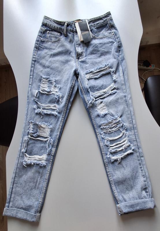 Стильные рваные джинсы от Misspap Джинс плотный, не тянется Состав: 100% хлопок Размер S Замеры: Длина - 98см Крок - 69см ПОпояс - 38,5см ПОБ - 47см Посадка - 30/40см Ширина штанини верх - 29,5см Ширина штанини по низу - 15,5см Цвет - голубой Новые, с биркой