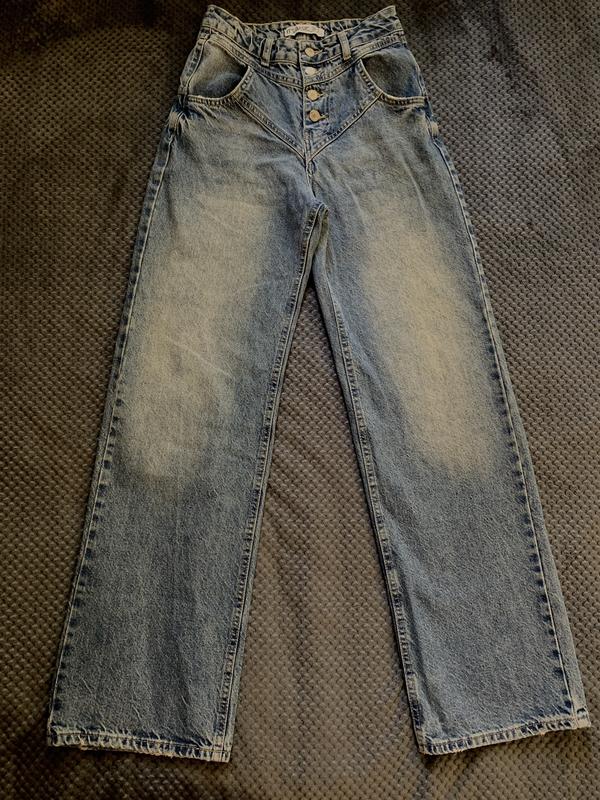 Светлые джинсы с высокой талией Модные джинсы прямого, свободного кроя с завышенной талией. Отлично подчеркивают фигуру и создают стильный, современный образ. Подойдут для ежедневного использования или для модных повседневных луков. Состояние: идеальный Размер: Талия 30-32 Стегна 45 Длина 110