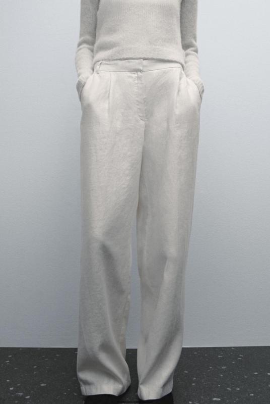 Широкі лляні штани, колір cream Стильні та комфортні штани з вільним кроєм від стегна до щиколотки. Висока посадка підкреслює фігуру, а еластична вставка на талії дарує зручність у щоденному носінні. • Легка й дихаюча тканина з 100% льону • Зручна застібка на блискавку та ґудзик • Дві практичні бічні кишені • Акуратна прорізна кишеня ззаду Ідеальний вибір для спекотних днів та створення стильних літніх образів Розмір по бірці 42. Ціна 2700 грн