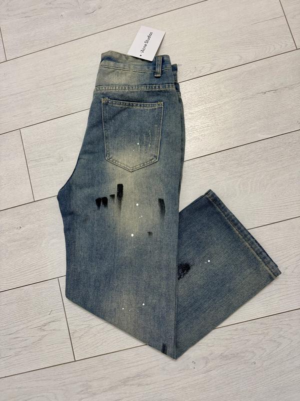 Джинси від Acne Studios Стильного кольору ( з елементами фарби та брудного потертого джинсу ) Нові Бірки, лого пакування оригінал Розмір М (29) Вдягнуто зріст 1.68 Заміри довжина всіх джинсів від пояса до кінця штанини 97 см Довжина по внутрішньому шву 66 см Пот 38 см, поб 48 см Ширина штанини внизу 19 см
