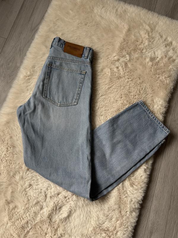 класичні джинси прямого крою з дуже цупкого деніму, блакитного кольору. Параметри: талія - 37, стегна - 50, довжина - 102