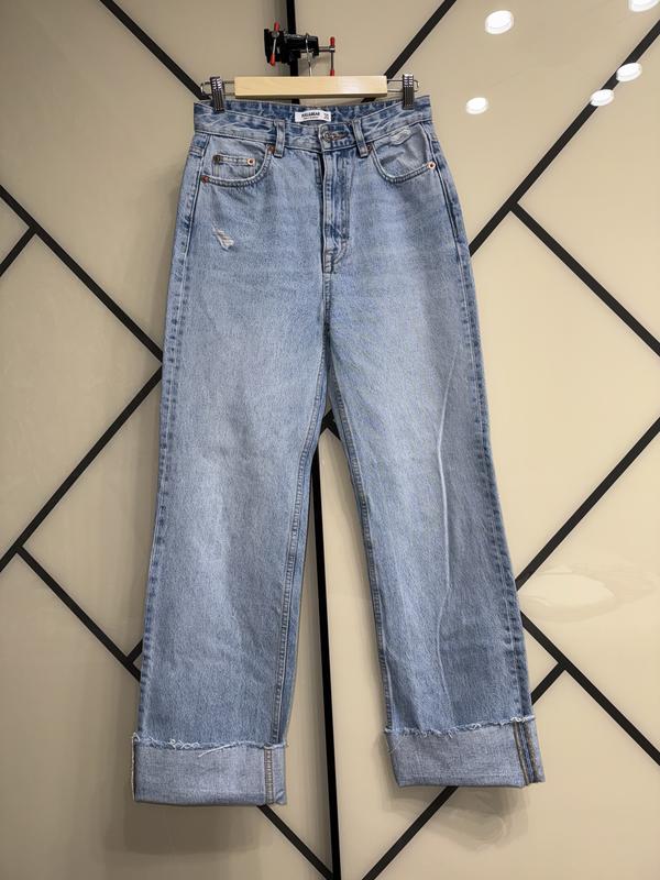 Підвернуті джинси з декоративними потертостями і необробленими краями штанин. Напівобхват - талія 36 см. - бедра 54 см. Ширина штанини внизу 23 см. Довжину можна регулювати.
