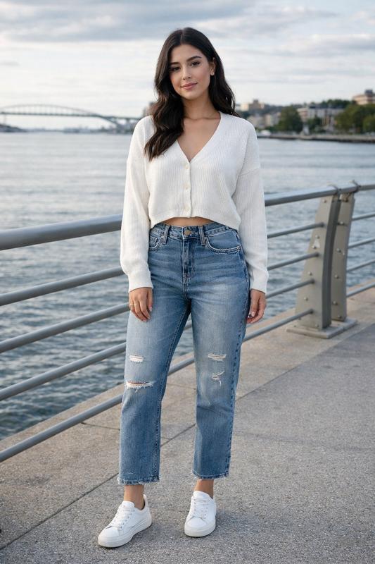 Джинси у відмінному стані на розмір Л. Прямого крою, укорочена модель. 100% коттон Довжина внутрішнього шва 67 Довжина зовнішнього шва 89,5 В поясі 43 см В стегнах 54 Посадка 33 см
