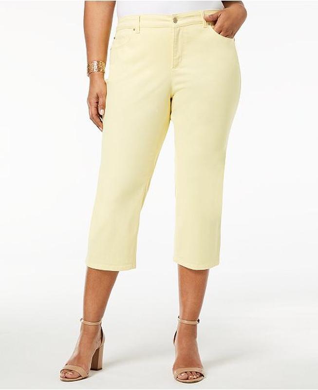Брендові жіночі капрі яскраво-жовтого кольору від світового бренду. Висока посадка , пошиті по фірмовому лекалу , завдяки чому ідеально лягають по фігурі підкреслюючи всі її принади. Капрі літом легко замінюють джинси , не жарко і довжина нейтральна. Добре поєднуються із різними блузами, маєчками , футболками чи сорочками тим самим щоразу створюючи новий образ. Розмір 8{L}.Довжина 84 см.,талія- 80см, обхват бедер -92см, довжина по внутрішньому шву-60см. Виготовлено в Іорданії.