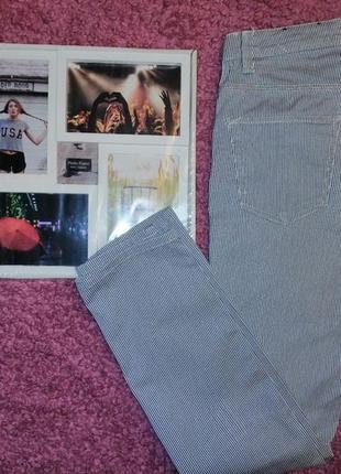 Очень классные джинсы белые в синюю полоску. Тянутся, но не сильно. Замеры : *ПОТ 36 см *высота посадки спереди 27 см, сзади 31, 5 см. *ПОБ 48 см+ *шаговая длина 66 см *длина полностью 91 см. Следов носки нет.