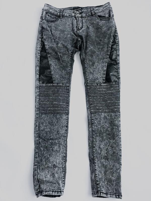 Очень крутые джинсы с кожаны и вставками. Размер М-L Длинна 100 Обхват талии - 40 Шаговый шов -25 Обхват бёдер -47 Обхват одного бёдра 21 Обхват внизу штанины 14,5 Есть дефект: не работает молния
