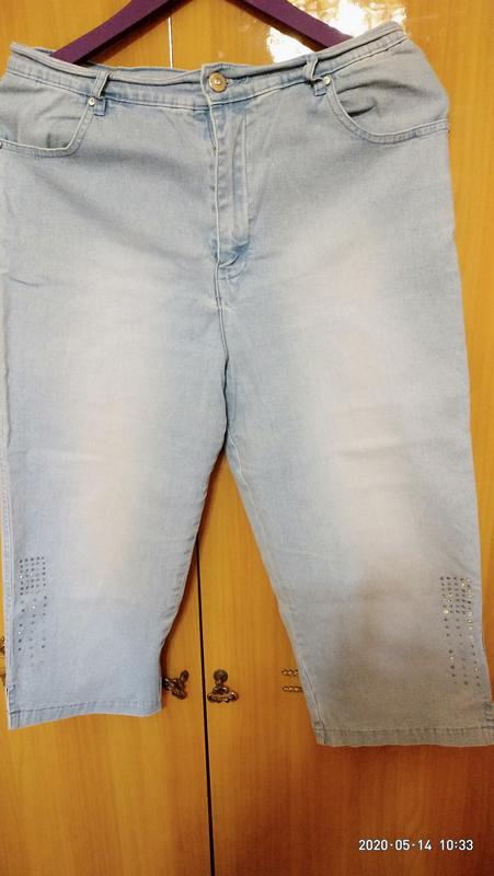 Стрейчевые джинсовые капри, очень удобные. Длина 72 см, шаговая 44, пояс 38, бедра 48 см, тянутся. Из нюансов: на штанинах не хватает стразиков, в цене учтено.