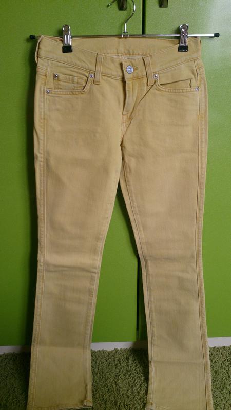 Стильные плотные, желтые джинсы с потертостями. Длина полная 98 см,шаговый 79 см,полупояс 33 см,полуОб 41 см+ немного тянется. Состояние отличное.