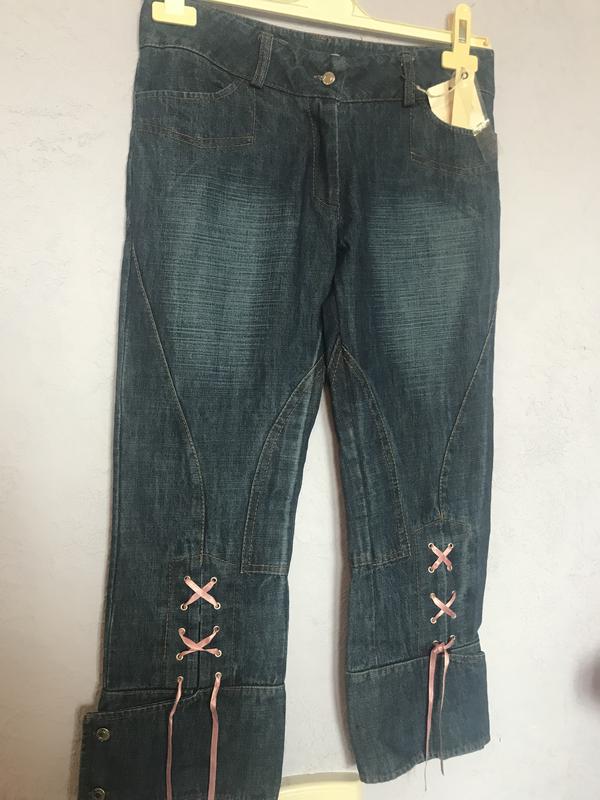 Нові джинсові Капрі з обробкою тасьмою внизу. Колір тасьми або шнурка можна змінювати за бажанням. Піт 42, співаю 52 довжина 78