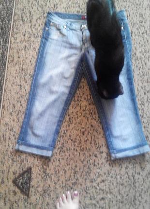 Отличные джинсовые бриджи, сидят на фигуре изумительно красиво. Замеры: ПОТ - 43 см, ПОБ - 52 см,длина по внешнему шву - 72 см (отворот 4 см), длина по внутреннему шву - 53 см (+отворот 4 см высота посадки спереди - 21 см, высота посадки сзади 0 32 см, ширина штанины вверху в самом широком месте - 29 см, ширина штанины внизу - 18 см. На все вопросы отвечу дополнительно
