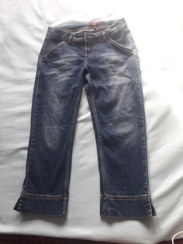 джинси вкорочені,як бріджі,38розмір,мають білу маленьку пляму/див.фото/,.джинс якісний довжина85см по зовн.шву,61см по внутр.шву,в поясі84--86см,в бедрах 102--104см,ширина штанки низом 20/40см,є бокові розрізи