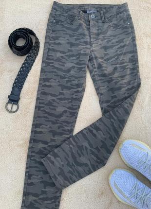 Фирменные джинсы в стиле милитари Yessica. Новые, бирка снята. Размер S. Состав 68% коттон, 29% полиэстер, 3% эластан. Немного тянуться. Смотрятся очень стильно. Замеры: ПОТ - 37 см ПОБ - 44 см Посадка перед - 22 см Посадка зад - 34 см Длина штанины по наружной стороне бёдра - 90 см Длина штанины по внутренней стороне бедра - 67 см