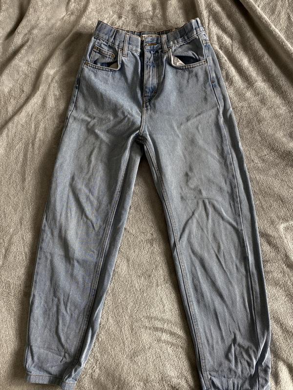 світлі мом джинси приємний голубий колір обшиті коричневою ниткою довжина 90 см ширина в талії 32 см в бедрах 45 гарно тягнуться