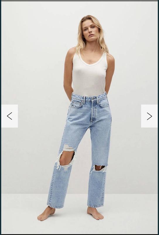 Плотный джинс, рваные колени, прямой крой , высокая талия . 34 размер замеры : Т 34 Б 44 ДВШ 80