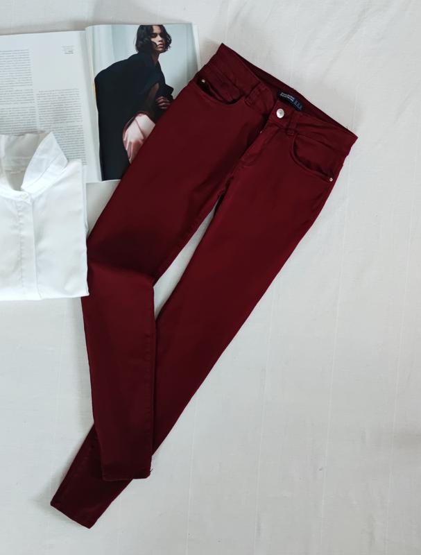 джинси скіні від Zara в кольорі марсала, добре тягнуться, сідають по фігурі, розмір вказано 36, ширина поясу в спокійному стані 32 см, ПО бедер 42 см, довжина 90 см