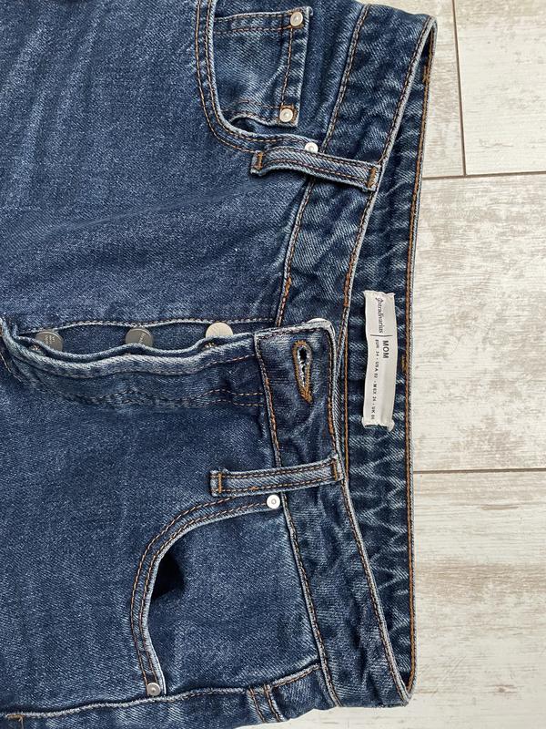 Джинсы мом, идеальный покрой. Цвет классический синий джинс, на фото немного искажен. Дефектов нет. Замеры: ПОТ - 35-36см ПОБ - 46-47см Общая длина 94см Внизу штанины 15см