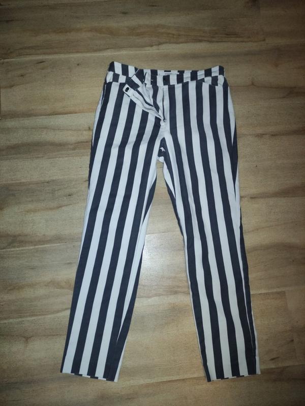 Плотный хлопок, хорошо"стрейчевый".Пот,-39.5 Поб-48 (тянется до 56) ,Длина по боковому шву-91, длина по внутреннему шву-68, полуширина внизу -15.5, нет никах дефектов. Посадка средняя.Очень стройнят за счёт полоски!