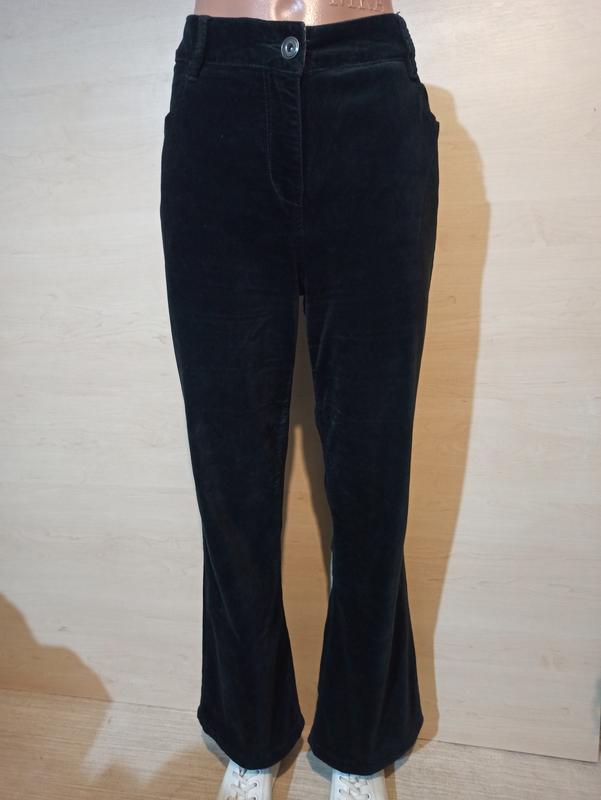 Черные средней плотности велюровые бархатные джинсы,слегка расклешенные от колена.По пояса 46 см ,Поб 57 см,длина брюк 101/72 см ,ширина 32/25 см ,ширина в колене 22 см,посадка 22/39 см.Джинсы тянутся. Состав ткани 98% хлопок,2%эластан.