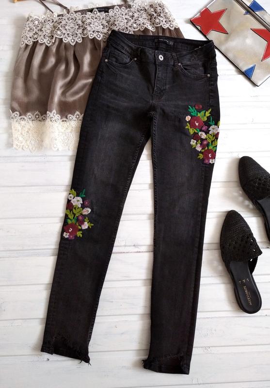Стильні чорні джинси з вишивкою. Тканина тягнеться. ПОТ 34.5 ПОС 40.5 Довжина 92 Довжина по внутрішньому шву 70.5 Посадка 21.5/32 Півоб*єм штанини 22/12 Склад: 98% бавовна, 2% еластан