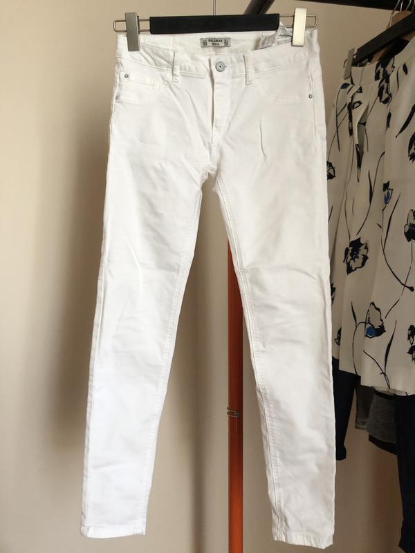 Одягались один раз, є пару слідів від крапель дощю на штанині сзаду (останнє фото), а так ідеальний білий. Не вірте бірці, в мене 36 і ця модель ну дууже слім, тому це абсолютний 34.