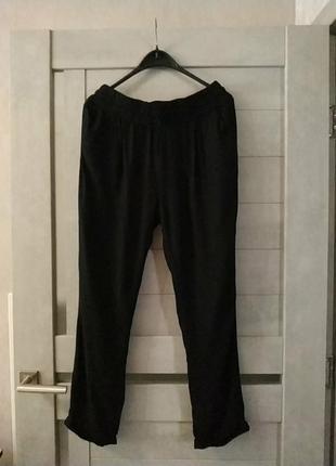 продам класснючие штани з подворотом на штанині, колір вугільно чорний,два кармашка з боків ,ззаду кишеня обманка пояс 39 тягнеться до 46 поб 55 посадка 29/38 довжина 95/68 ширина під матней 30,ширина внизу 18 бирки зрізані,тканина приємна на дотик схожа на віскозу не тягнеться