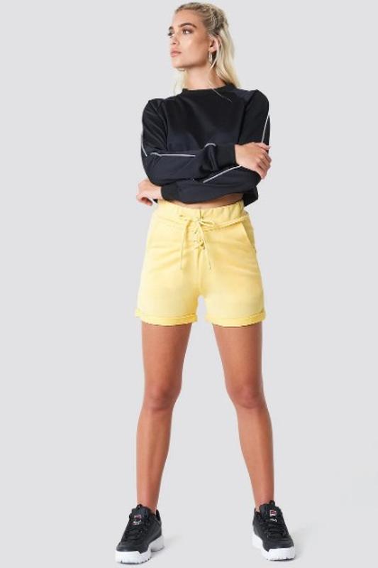 Шорты на шнуровке от Rut&Circle имеют высокий эластичный пояс, приятный мягкий материал, боковые карманы. Ткань хорошо тянется. Длина 39 см, ПО талия по резинке 34 см, ПО бедра 52 см.