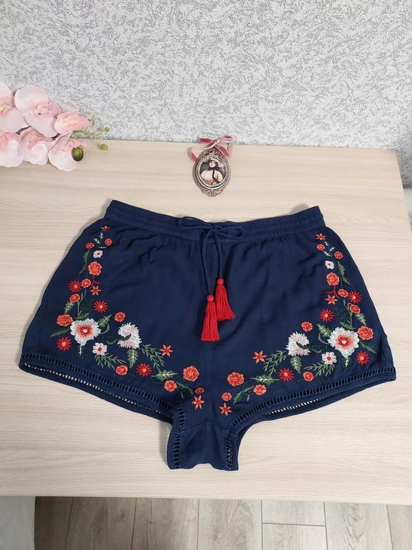 Женские синие с вышивкой шорты из вискозы,та подкладки из 100%котона, размером 10,38. В идеальном состоянии, пояс на резинке, все замеры на фото.