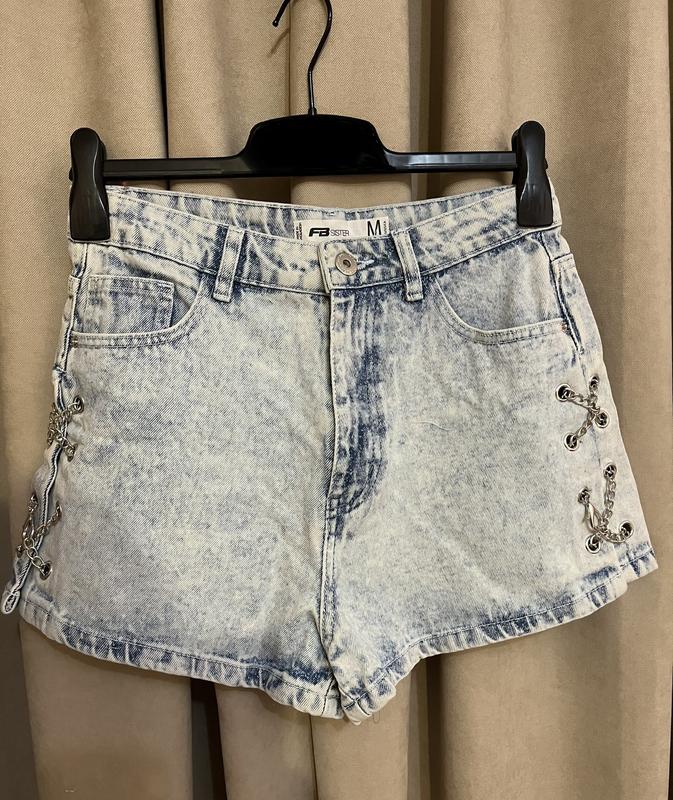 Джинсовые шорты с цепочками по бокам. Размер М. Полуобхват талии - 37 см, полуобхват бедер - 49 см, длина - 32 см.