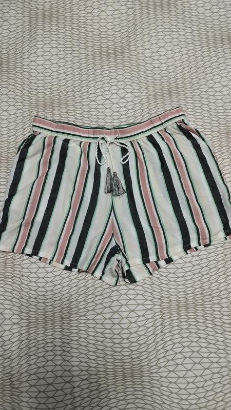 Длина по боковому шву 35 см, полуобхват талии 40 см,в поясе резинка, полуобхват бедер 53 см,2-и внутренние карманы, 100% вискоза.