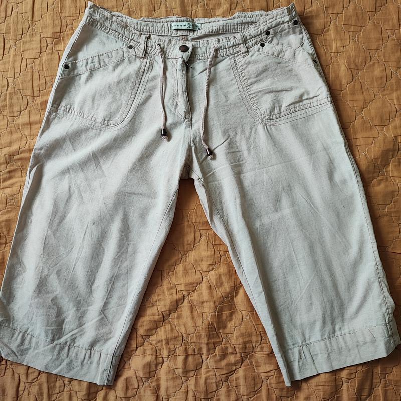 Летние лёгкие шорты-брюки прямого кроя из натуральной тонкой ткани - лен+хлопок. Не парят, не выгорают на солнце. Спереди и сзади по 2 функциональных кармана. Застёгивается на замок, в поясе затягиваются на шнурок. На последнем фото - едва заметный след от карандаша. Больше дефектов нет. Состояние идеальное.