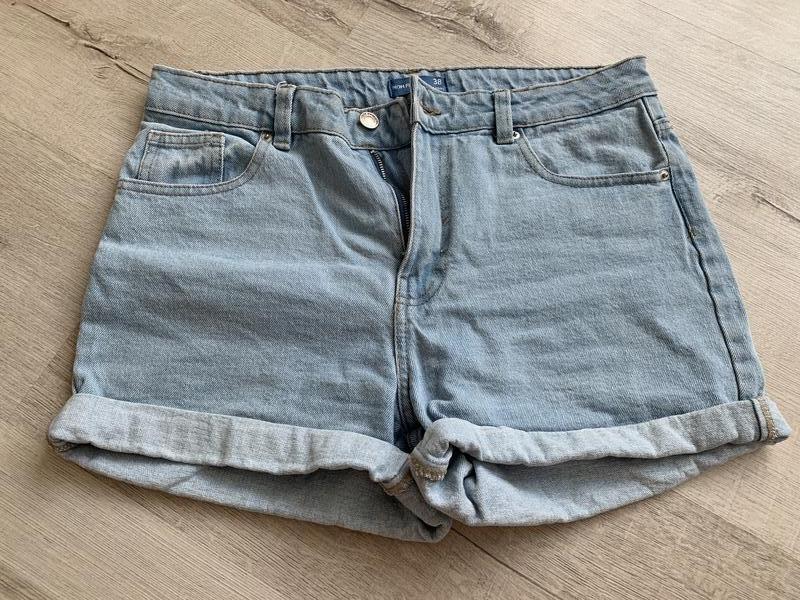 Класні шорти-мом з джинсу. Матеріал середньої щільності, не тонкий, трохи тягнеться. Стан практично ідельний, носила минулого літа після пологів один сезон, тепер стали завеликі. Заміри на фото