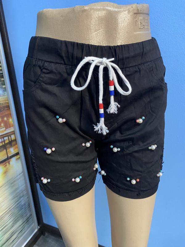 Черные шорты на резинке, с жемчужинками, имеют несколько размеров • 25 размер ( ширина 32, тянутся до 40; длина 33 см) •26 размер( 34 ширина, тянется до 44; длина 34 см) •27 размер( ширина 36, тянется до 46; длина 34) •28 размер ( ширина 36, тянется до 42; длина 34) •29 размер ( 38 ширина, тянется до 46; длина 35) • 30 размер (36 ширина, тянется до 44; длина 35)