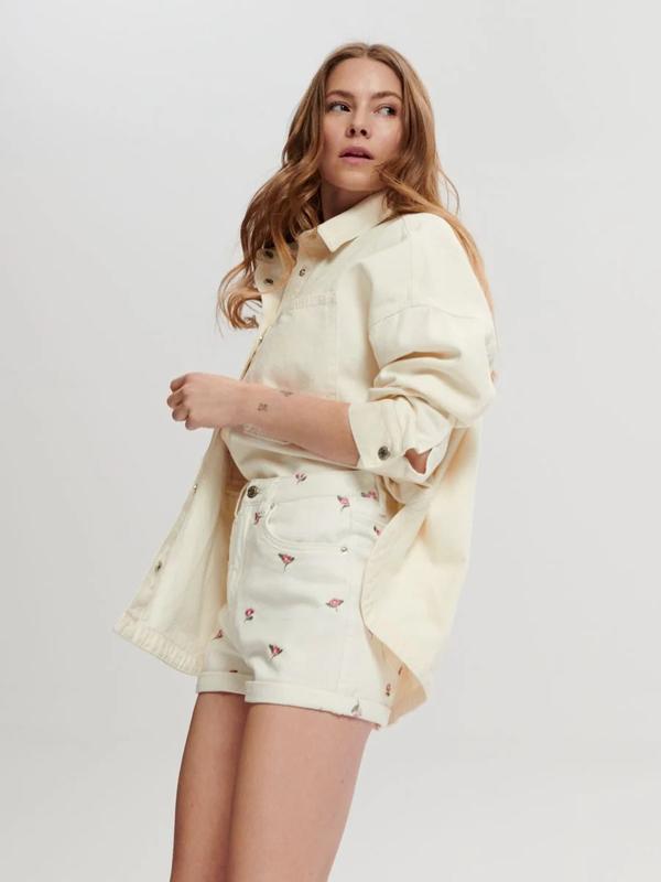 Стильні джинсові шорти молочного кольору з ніжними вишитими квіточками. Розмір xs. Заміри по виробу: довжина 33 см, талія 35 см, бедра 47 см. Тканина ще трохи тягнеться, але не сильно ( 1-2 см).
