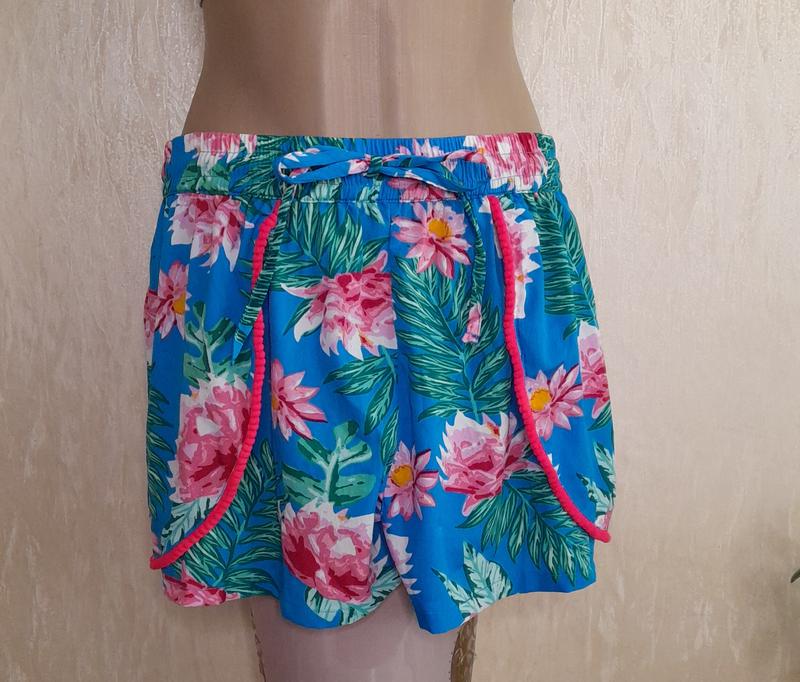 Яркие шорты из легкой ткани удобны, почти не ощущаются на теле, то что надо в жару, пояс резинка, при необходимости можно притянуть шнурочком, в красивом состоянии, размер 44-48