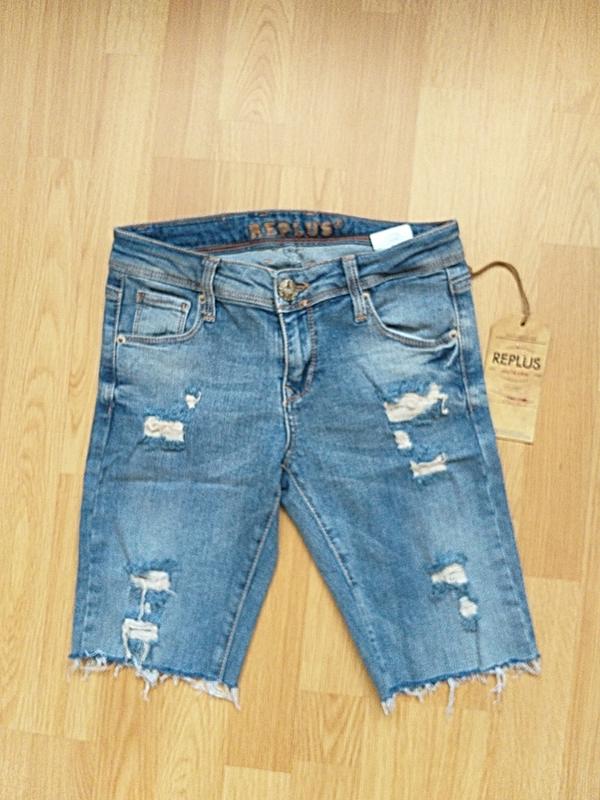 рвані, приглушенного синьо-голубого кольору, зі стрейчем, виробник Туреччина. Розмір 26)(30) пояс 68(76)см, бедра 88(96)см, посадка ззаду 31(33)см, довжина по боковому шву 39)(41)см, довжина по внутрішньому шву 23см
