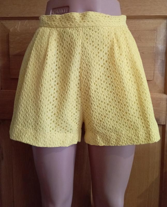Коттоновые, фирменные шортики насыщенного желтого цвета, с прошвой, с карманами, на подкладке. ПИТ 35-40 на резинке, ПИБ 60, длина по боковому шву 33, ширина штанины 34.