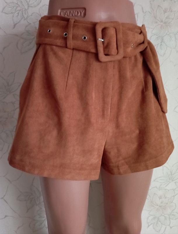 Стильные, фирменные шорты с карманами, ткань под замш. ПИТ 36-38, ПИБ 55, длина по боковому шву 33, ширина штанины 34.