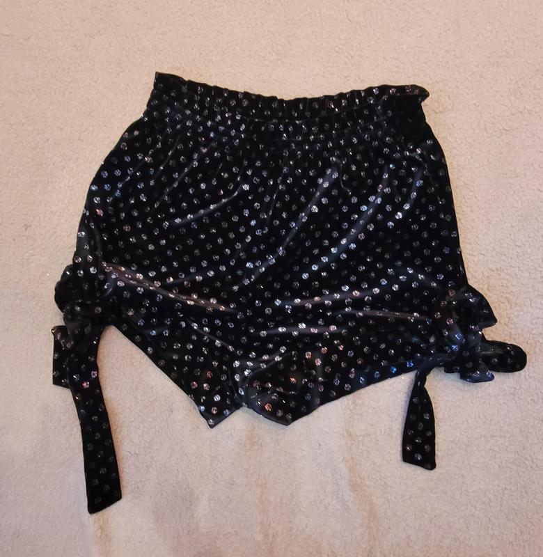 Велюровые шорты, сбоку на завязках, черные из блестящий горошек. На размер s. В новом состоянии, отсутствует бирка.