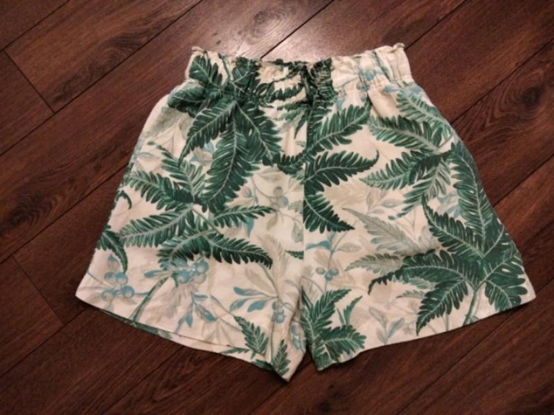 Шорти на високій посаді з тропічним принтом , кишені у бокових швах . Склад льон , віскоза. Довжина 44 см , пот 37 см у спокійному стані, пот 48 см у розтягнутому стані, пос 57 см, низ штанини 37см . Стан нової речі. Підійдуть на M, L. .