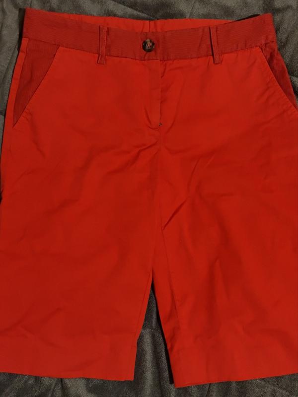 Очень стильные шорты бермуды, красивого красного цвета. посадка средняя высота сидения по переду с поясом -22 см, по заду - 33 см, полуобхват талии -38 см, полуобхват бедер - 46.5 см, длина с поясом по боковому -52 см, длина по шаговому -31 см, ширина штанки в низу - 21.5 см в половинному.