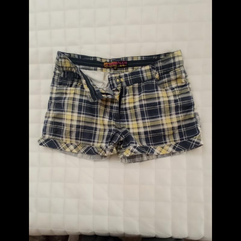 шорты .змейка спереди пластик.пуговки три шт.на карманах крупный пластик на верёвках.пояс внутри укреплён лентой.петли ремня.спереди карманы как на джинсах .сзади два с клапанами на пуговках.бренд испанский лишит китае.100% хлопок. размер- 42. состояние на очень хорошее +. замер:42- пояс*30.5- длина*29- низ выход.