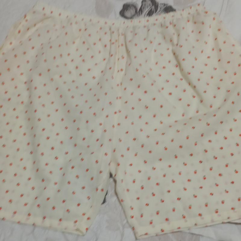 Легенькі ,молочного кольору шорти ,є кармани. Тканини з складом немає,але схожа до віскози. Ширина в поясі 43,тягнеться до 66 Довжина 53 НОБ 67