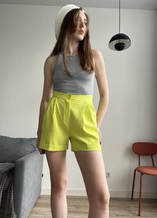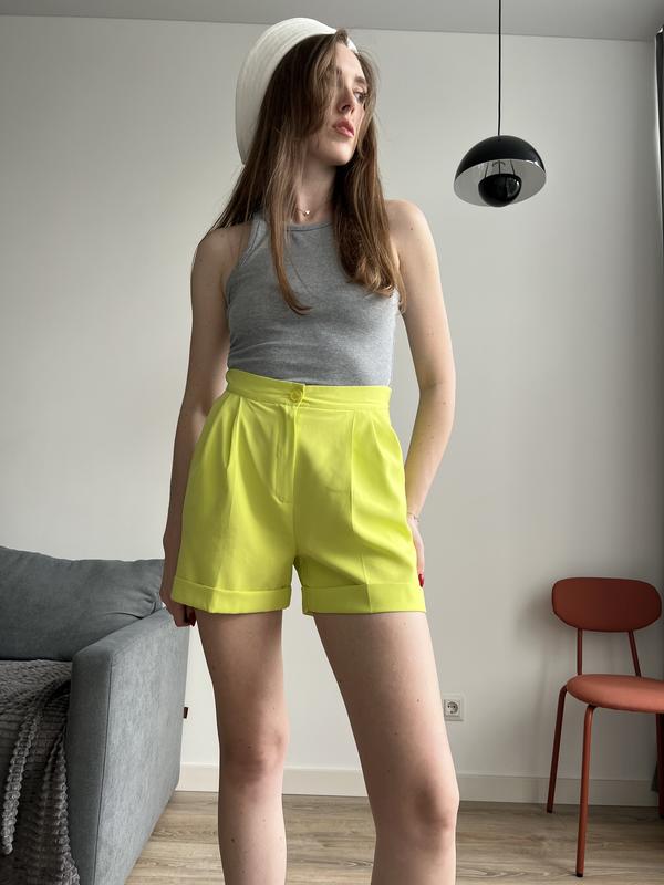 Короткие шорты салатового (лимонного) цвета от gepur Размер 38/M Полуобъем талии 30 см Полуобъем бедер 50 см Длина по боковому шву 40 см. Состояние идеальное, одевались один раз На талии со спины резинка, поэтому хорошо тянутся