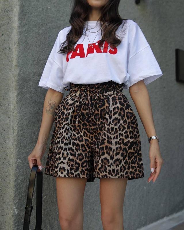 Шорти ■ Модель 0442.35 ■ Ціна 570 грн ■ Тканина: ТУРЕЦКИЙ ШТАПЕЛЬ ■ Колір : лео прінт ■ Розмір: 42-44,46-48,50-52 ■ Опис: На зображенні представлені шорти із леопардовим принтом. Шорти мають вільний крій та виконані з легкої тканини. Штапель, відомий своєю м'якістю, легкістю і повітропроникністю, ідеально підходить для літнього одягу. Пояс шорт має складання та зав'язується на шнурок, що дозволяє регулювати посадку на талії. Принт виконаний у традиційному стилі леопардового кольору з чорними плямами на світло-коричневому тлі. Такі шорти ідеально підійдуть для створення стильного та невимушеного образу.