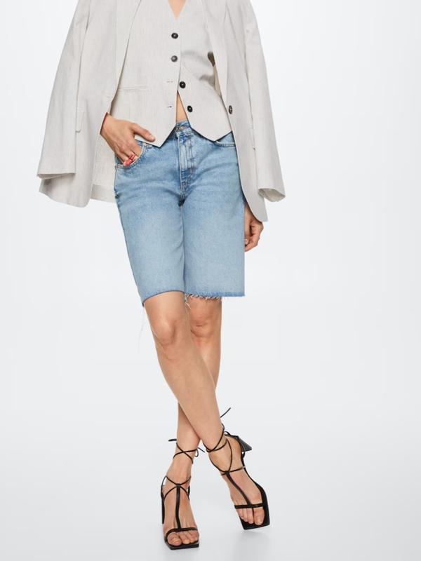 Джинсовые шорты с потертым краем Хлопковая ткань в джинсовом стиле. Прямой дизайн.. Пять карманов. Потертый подол. Застежка-молния и кнопка. Размер 34 Замеры: поб - 46 см полхват талии - 38 см длина полная - 51 см посадка - 25 см Состав: 80% хлопок, 20% переработанный хлопок