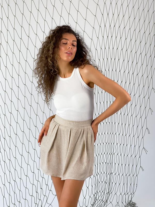 На поясе по заду резинка Высокая посадка Свободный крой Цвет беж в капленке Размеры: ХS.S